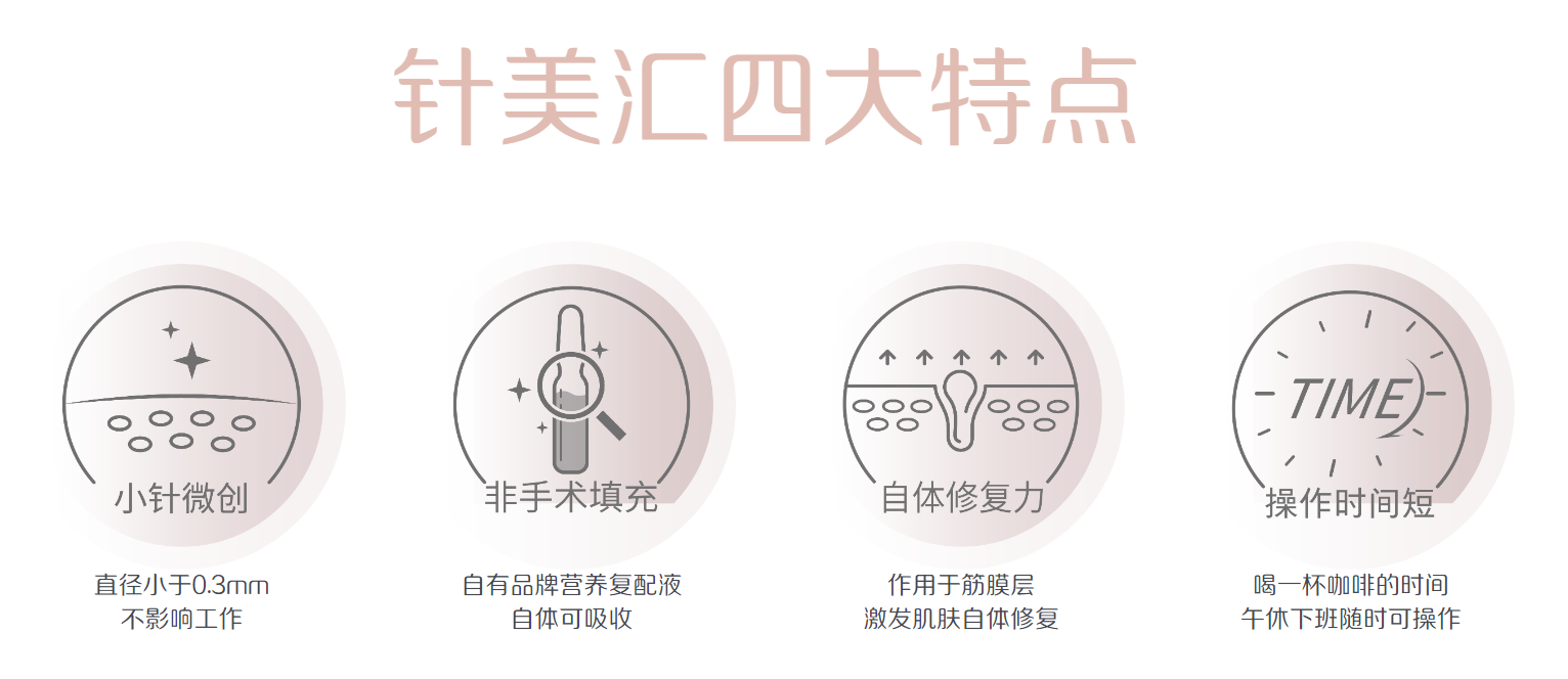 针美汇小针自体修复抗衰技术只需在衰老脱垂的关键点,将含有丰富营养成分的针美汇复配液注入到皮下,利用液体的软性剥离作用在皮下形成“微创伤”,人体组织受到创伤会激发自体修复能力。促进皮下大量粘连蛋白生成并连接成网,同时针美汇复配液的多种营养成分为周围的脂肪细胞提供营养,使其恢复饱满水润,新生的粘连蛋白和饱满脂肪实现相互作用,共同增加皮下占位,使皮肤恢复紧致平整。